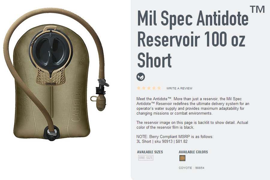 CamelBak je na ovogodišnjem SHOT Showu predstavio novi hidracijski sistem Mil Spec Antidote™ Reservoir. Kao što smo najavili mnoštvo informacija o proizvodima nam je postalo dostupno tek nakon što je SHOT završio, a jedna od njih je predstavljanje ovog mjehura za vodu. Kapacitet Antidotea je tri litre vode. Njegova forma je nešto šira i niža od drugih Camelbakovih mjehura. Proizvođač je da bi izbjegao povećanje debljine rezervoara zbog ovako široka oblika u njega ugradio pregradu. Ono što se nama posebno svidjelo je povećanje ruba otvora spremnika čime se olakšava njegovo držanje pri punjenju. Taj rub je perforiran da se smanji zadržavanje vode na njemu nakon točenja i time spriječi unošenje vode u torbu, prsluk ili neki drugi sustav u koji će se umetnuti ovaj Camelbakov rezervoar.